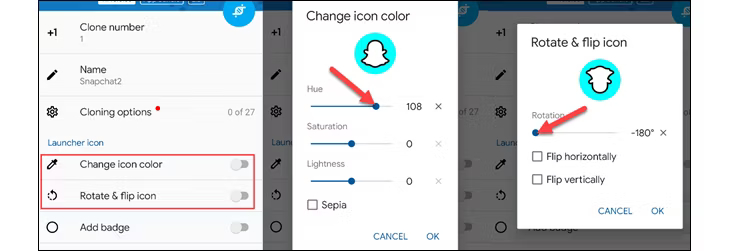 بعد از انتخاب نام برنامه، می‌توانید آیکون آن را نیز دست‌خوش تغییر کنید. عوض کردن آیکون برنامه‌ی دوم از طریق چرخاندن آن یا تغییر دادن رنگش صورت می‌گیرد. شایان ذکر است که برنامه‌ی App Cloner در این زمینه گزینه‌های دیگری را نیز در اختیار کاربران قرار داده اما در این متن به همین دو گزینه بسنده می‌کنیم و بررسی باقی موارد را به‌عهده‌ی خودتان می‌گذاریم.