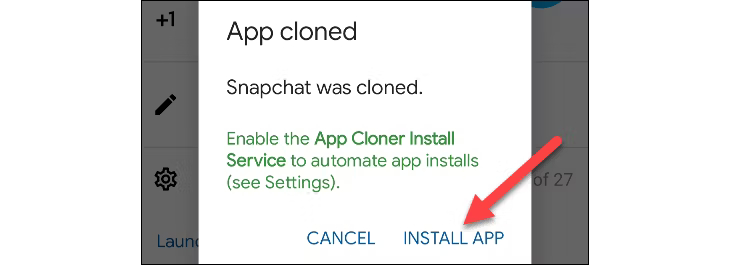 بعد از اتمام فرآیند کلون کردن برنامه، می‌توانید بر روی «Install App» ضربه بزنید تا نصب برنامه آغاز شود. قبل از این کار اما باید به برنامه‌ی App Cloner مجوز و دسترسی لازم برای کلون‌سازی را بدهید.
