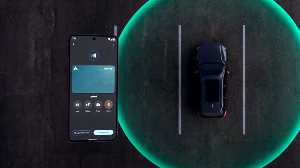 در حالیکه برای استفاده از باند فوق عریض در قابلیت «بهاشتراکگذاری سریع» تنها به دو گوشی اندرویدی ساده نیاز بود، برای بهرهمندی از امکانات «کلید دیجیتال اندرویدی خودرو» لازم است مالک یک خودرو سازگار با UWB باشید! بهطور کلی این قابلیت به کاربران اجازه میدهد بدون نیاز به سوئیچ خودرو، آن را روشن یا خاموش کنند. علاوه بر این در صورت استفاده از کلید دیجیتال اندرویدی خودرو با نزدیک شدن کاربر به یک شعاع مشخص (در حوالی خودرو)، قفل خودرو بهصورت خودکار غیرفعال شده و در صورت اعمال برخی از تنظیمات نرمافزاری، خودرو بهصورت کامل روشن میشود. این در حالی است که با دورشدن کاربر از خودرو قفل آن بهصورت خودکار فعال میشود. علاوه بر این، تمامی این وقایع در شرایطی رخ میدهد که کاربر برای استفاده از کلید دیجیتال اندرویدی خود به باز کردن قفل صفحهنمایش گوشی خود نیازی نداشته و تمامی این اقدامات بهصورت خودکار صورت میپذیرند.