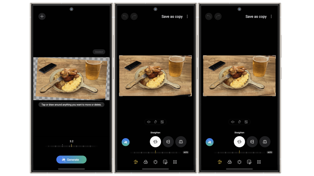 در مجموعه قابلیتهای مبتنی بر هوش مصنوعی گلکسی امکان «جابجایی اشیاء به مکان منتخب، چرخاندن و تنظیم ابعاد و اندازه آنها» نیز وجود دارد. به عنوان مثال در تصویر زیر، ضمن جابهجایی لیوان نوشیدنی، بر روی اندازه و ابعاد آن نیز تغییراتی اعمال شده است. برای استفاده از این قابلیت لازم است از دستورالعمل زیر پیروی کنید: