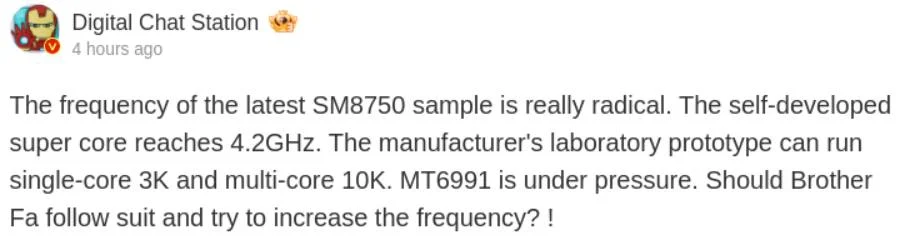 همچنین به گفته DCS یک نمونه آزمایشگاهی از تراشه اسنپدراگون 8 نسل 4 در یک بنچمارک معتبر (احتمالاً گیکبنچ) توانسته به امتیاز «3000» در تستهای تکهستهای و «10000» در تستهای چندهستهای دست یابد! با در نظرگیری این امتیازات، تراشه پرچمدار بعدی کوالکام در مقایسه با نسل پیش از خود (اسنپدراگون 8 نسل 3) به ترتیب «35.5 درصد» و «33.9 درصد» در عملکرد تکهستهای و چندهستهای بهبود یافته است! این در حالی است که میانگین امتیازات کسبشده توسط تراشههای پرچمدار در 2 سال اخیر به بازههای زیر محدود میشوند: