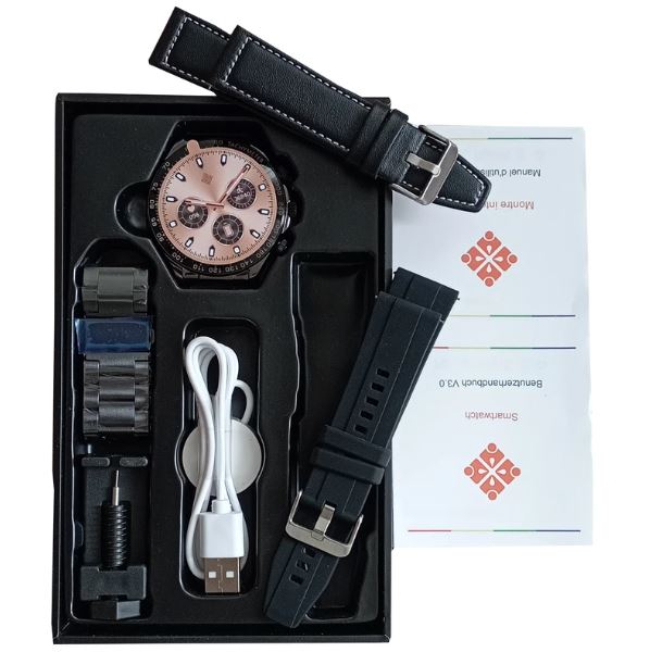 • در جعبه ساعت، علاوه بر خود ساعت، دو بند اضافه نیز وجود دارد که می‌توانید بر اساس سلیقه و موقعیت، بند مورد نظر خود را انتخاب کنید. دفترچه راهنما نیز در جعبه قرار دارد که راهنمایی کامل و جامع برای استفاده از تمام امکانات ساعت ارائه می‌دهد و به سوالات متداول کاربران پاسخ می‌دهد. یک سیم شارژ مخصوص نیز برای شارژ ایمن و سریع ساعت در جعبه موجود است. همچنین، یک ابزار کوچک کردن بند نیز در جعبه قرار دارد که به شما کمک می‌کند تا اندازه بند را بر اساس سایز مچ دست خود تنظیم کنید و از راحتی در استفاده از ساعت لذت ببرید. این اقلام همراه، تجربه‌ای کامل و بی‌نقص را برای شما فراهم می‌کنند.