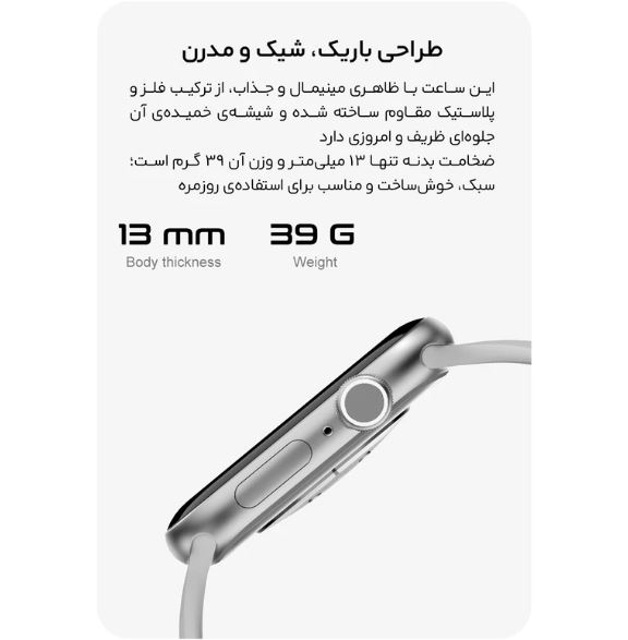 - این ساعت برای پاسخگویی به نیازهای مختلف کاربران توسعه یافته و به همین دلیل کاربری آن را میتوان ورزشی، رسمی و روزمره تعریف کرد. از نظر ابعاد، سایز قاب ۴۶ میلیمتر و وزن ۳۹ گرم، آن را به گزینهای سبک و نسبتاً بزرگ روی مچ دست تبدیل کرده است. بدنه این محصول از جنس فلز ساخته شده که استحکام خوبی را فراهم میآورد و در برابر آسیبهای سطحی مانند خط و خش مقاوم است. صفحه نمایش آن مستطیلی شکل بوده و ابعاد ۲.۰۲ اینچ دارد. در زمینه بند، جنس آن سیلیکون بوده و برای سهولت در تعویض استایل، پنج بند متنوع همراه با محصول ارائه میشود؛ با این حال، لازم است توجه شود که به دلیل فرایندهای تولید کارخانه، ممکن است تفاوتهایی در طرح و رنگ این بندها با تصاویر تبلیغاتی مشاهده شود.