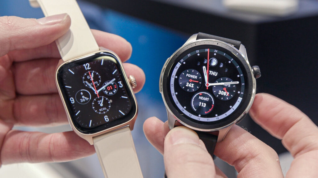 • طراحی دوم: طراحی صفحه نمایش مربعی‌شکل با گوشه‌های منحنی (Squircle) و لبه‌ها و حاشیه‌های اطراف نمایشگر نسبتاً قطور مشابه با ساعت‌های اپل واچ (مانند ساعت اپل واچ اولترا 2)
