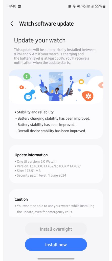 فراموش نکنید که برای نصب به‌روزرسانی لازم است شارژ گلکسی واچ اولترا حداقل به «30 درصد» برسد، چرا که در غیر این صورت امکان ادامه فرآیند نصب وجود ندارد.
