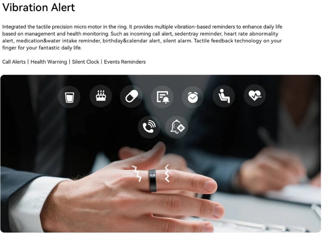 حلقه هوشمند رولمی وایب دارای یک موتور لمسی دقیق است که هشدارهای لرزشی ظریفی را برای تماسها، پیامها، یادآوریها و اعلانهای فعالیت ارائه میدهد. همچنین شامل هشدارهای مربوط به آب و دارو است و تضمین میکند که کاربران روال سلامتی خود را حفظ کنند.
