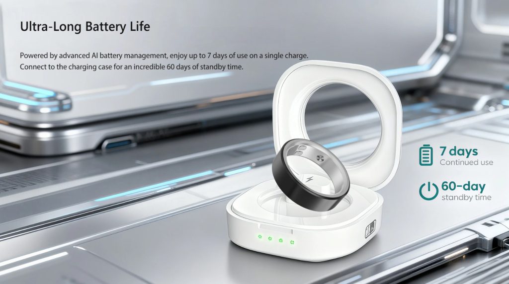 حلقه هوشمند وایب که از نانوسرامیک میکروکریستالی بادوام ساخته شده است، در برابر خراش و خوردگی مقاوم است و مقاومت در برابر آب 5ATM آن را برای شنا، دوش یا باران مناسب میکند. باتری این گجت با هر بار شارژ تا هفت روز دوام میآورد، در حالیکه قاب شارژ قابل حمل آن زمان آماده به کار را تا 60 روز افزایش میدهد.