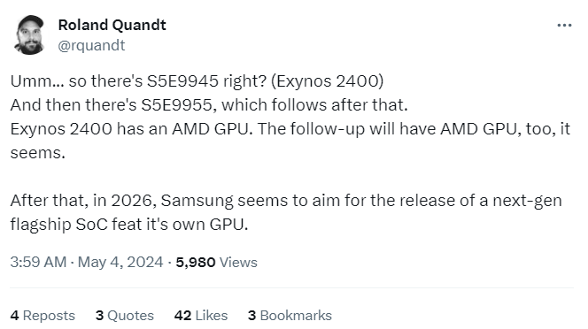 بر اساس توئیت حساب کاربری rquandt در شبکه اجتماعی X، کمپانی سامسونگ در پی آن است تا در نسل بعدی تراشههای اگزینوس خود (احتمالاً اگزینوس 2600)، پردازنده گرافیکی Xclipse (که در همکاری مشترک سامسونگ با کمپانی AMD توسعه داده شده بود) را با واحد پردازش گرافیکی دیگری جایگزین کند. از این رو، احتمال میرود تراشه اگزینوس 2500 آخرین چیپست مجهز به پردازنده گرافیکی مبتنی بر معماری RDNA ایامدی سامسونگ باشد.