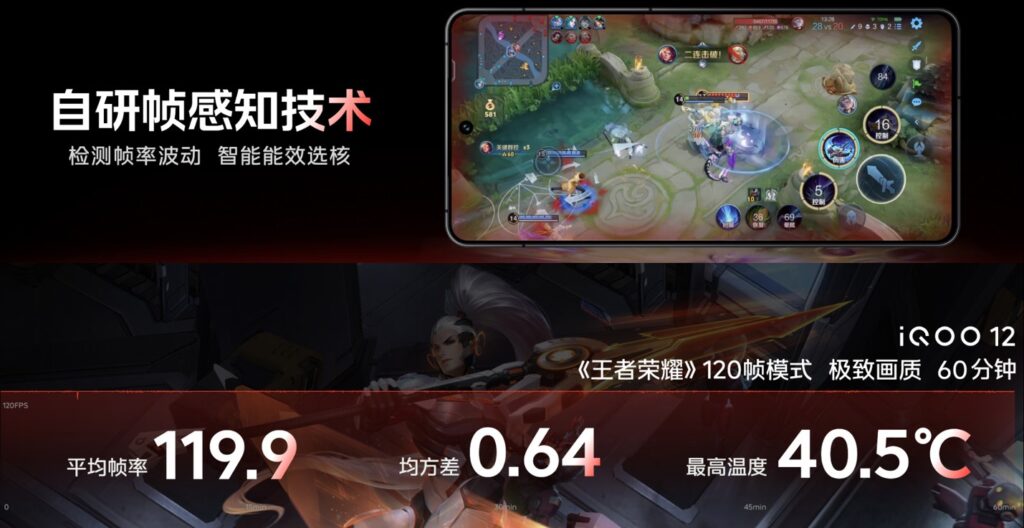 این تراشه از عملکرد روان گوشی در بازیهای ویدیویی تا 144 هرتز (در رزولوشن 1080P) پشتیبانی میکند و قادر است ترفندهایی مانند “درج فریم با تأخیر کم، سوپرفریم و وضوح فوقالعاده (از طریق سوپرنمونهبرداری شبیه به تکنولوژی DLSS)” را ارائه دهد. علاوه بر این، کمپانی iQOO یک محفظه بخار 5705 میلیمتر مربعی را به منظور دفع گرمای تولیدشده، در این دستگاه تعبیه کرده است.