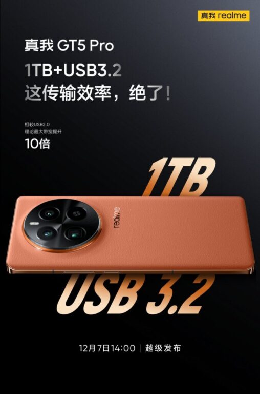 علاوه بر این، در یک پوستر تبلیغاتی دیگر، اطلاعاتی در رابطه با حداکثر ظرفیت فضای ذخیرهسازی و پورتهای اتصال ارائه شده است. بنا به این اطلاعات، ریلمی GT5 پرو از فضای ذخیرهسازی داخلی حداکثر 1 ترابایتی بهره میبرد و از اتصال به پورت USB 3.2 پشتیبانی میکند. اما از آنجایی که پورتهای USB 3.2 انواع مختلف و نسلهای متنوعی دارند، شاید بهتر بود که ریلمی اطلاعات دقیقتری را در رابطه با اتصال پورت USB ارائه میداد یا سرعت واقعی انتقال داده در این پورت را با رسانهها در میان میگذاشت!