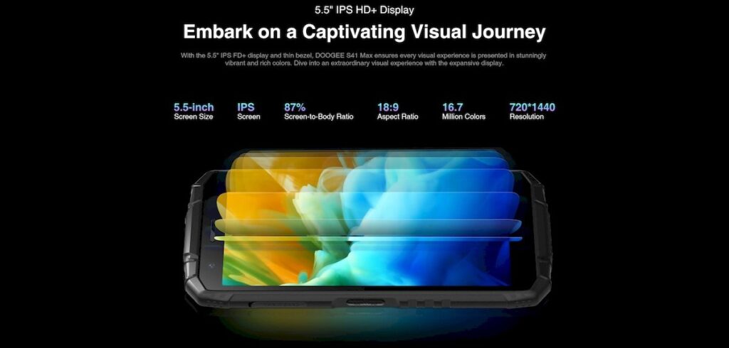 جدیدترین گوشیهای جان سخت دوجی (Doogee) از صفحه نمایش IPS در ابعاد 5.5 اینچ با رزولوشن +HD بهره میبرند و تصاویر را با نسبت 18:9 برای کاربران خود به نمایش میگذارند. با مشاهده دقیقتر صفحه نمایش، یک دوربین سلفی 8 مگاپیکسلی (توسعهیافتهشده توسط کمپانی سونی) در سمت چپ قسمت بالای گوشی به چشم میخورد.