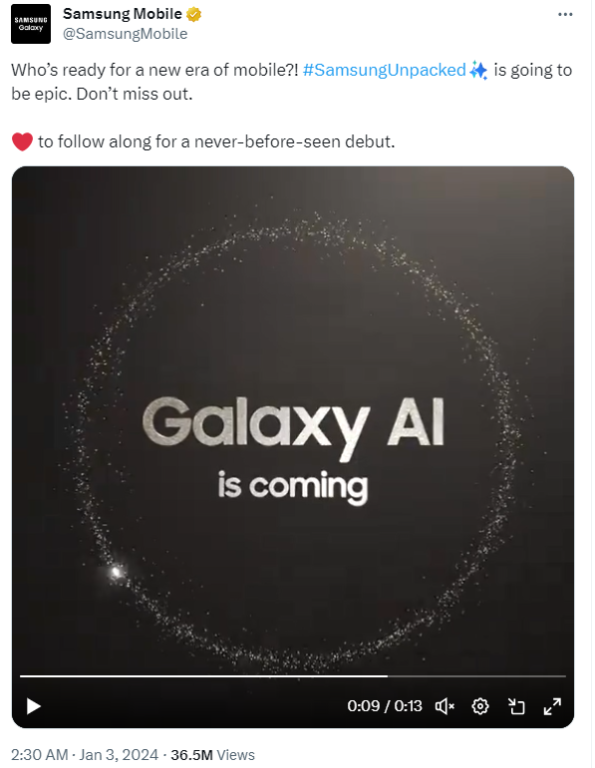 روز گذشته کمپانی سامسونگ ضمن انتشار یک ویدیو تبلیغاتی، به صورت رسمی از برگزاری رویداد Unpacked سری گلکسی S24 و رونمایی از هوش مصنوعی گلکسی (Galaxy AI) در تاریخ 17 ژانویه (27 دیماه) خبر داد.