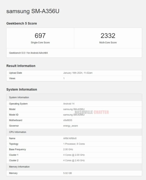 زمانی زیادی از انتشار تصاویر رندر گوشی گلکسی A35 سامسونگ نمیگذرد و حالا پس از گذشت 2 ماه، مشخصات کلیدی و امتیازات کسبشده توسط این دستگاه در بنچمارک گیکبنچ نیز منتشر شده است. با استناد به اطلاعات منتشرشده،، گلکسی A35 با شماره مدل “SM-A356U” به تراشه اگزینوس 1380 سامسونگ و رم 6 گیگابایتی مجهز خواهد بود.
