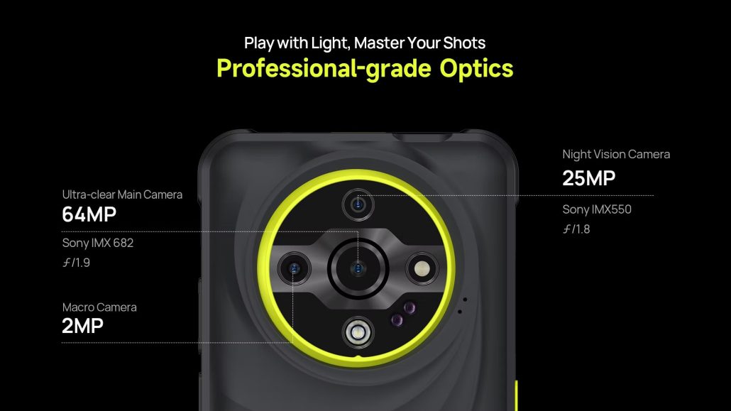با حرکت به سمت قاب پشتی یولفون آرمور X31 پرو با جزیره دوربین دایرهایشکل این دستگاه مواجه میشویم. این جزیره دوربین مرکزی به تنظیمات دوربین سهگانه متشکل از «یک سنسور IMX682 سونی با وضوح 64 مگاپیکسلی در دوربین اصلی، یک سنسور IMX550 سونی با وضوح 25 مگاپیکسلی در دوربین دید در شب و یک دوربین ماکرو 2 مگاپیکسلی» مجهز است.
