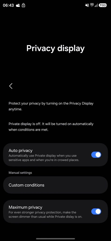 اکنون، یک کاربر در شبکه اجتماعی ایکس، تصاویری را به اشتراک گذاشته است که نحوه این عملکرد سامسونگ را روشن می‌کند. یک گزینه Auto Privacy در تنظیمات وجود دارد که می‌تواند نمایش حریم خصوصی را در مکان‌های عمومی شلوغ، از آسانسور گرفته تا وسایل حمل و نقل عمومی، فعال کند. از طرف دیگر، می‌توانید از یک برنامه برای روشن یا خاموش کردن این ویژگی استفاده کنید. شما همچنین قادر خواهید بود برنامه‌هایی را اضافه کنید که قابلیت نمایش حریم خصوصی (Privacy Display) برای آنها فعال می‌شود.