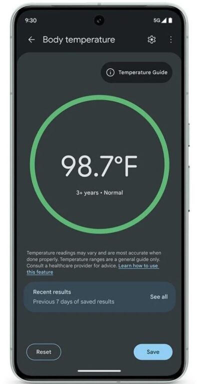 قابلیت Google Temperature عملکرد خود را از طریق “سنسور دما” تعبیهشده بر روی پیکسل 8 پرو به نمایش میگذارد. این ویژگی مورد تایید سازمان غذا و دارو ایالات متحده آمریکا (FDA) بوده و قادر است با اندازهگیری دمای بدن کاربر، عملکردی مشابه با دماسنج را به وی ارائه دهد. علاوه بر این، کاربران قادرند با ذخیرهسازی دمای اندازهگیریشده توسط گوشی بر روی حساب کاربری خود در مچبندهای سلامتی فیتبیت (FitBit)، بر روی شاخصهای سلامتی خود نظارت بیشتری داشته باشند.