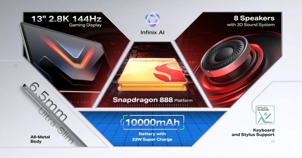 اینفینیکس ایکس پد جی تی (Infinix Xpad GT) به اسنپدراگون 888 کوالکام مجهز شده است؛ بله، یک تراشه 5 نانومتری از انتهای سال 2021 که در زمان خود قدرت بسیاری از گوشیهای پرچمدار را تامین میکرد. این تراشه با یک محفظه بخار بزرگ برای خنک کردن، 8 گیگابایت رم و 256 گیگابایت فضای ذخیرهسازی جفت شده است.